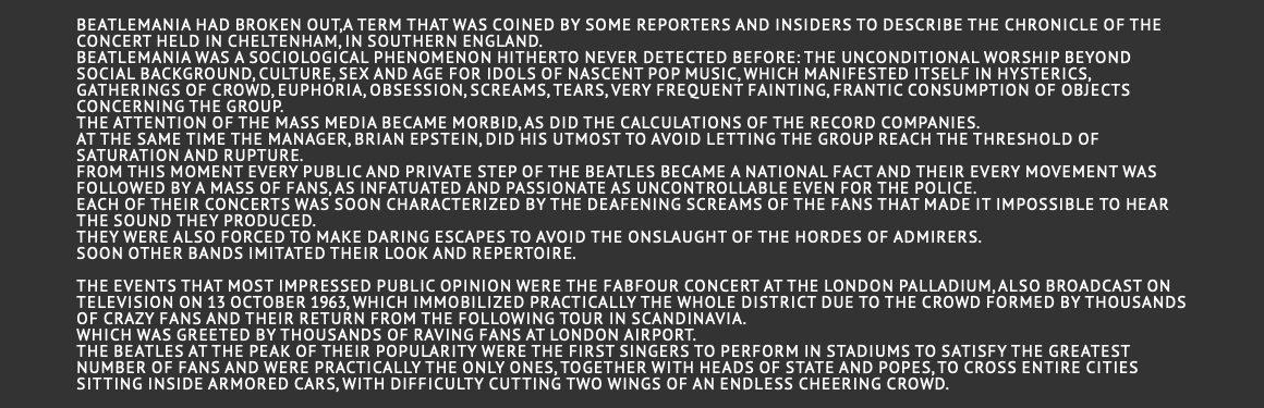 Beatlemania had broken out,a term that was coined by some reporters and insiders to describe the chronicle of the concert held in Cheltenham, in southern England. Beatlemania was a sociological phenomenon hitherto never detected before: the unconditional worship beyond social background, culture, sex and age for idols of nascent pop music, which manifested itself in hysterics, gatherings of crowd, euphoria, obsession, screams, tears, very frequent fainting, frantic consumption of objects concerning the group. The attention of the mass media became morbid, as did the calculations of the record companies. At the same time the manager, Brian Epstein, did his utmost to avoid letting the group reach the threshold of saturation and rupture. From this moment every public and private step of the Beatles became a national fact and their every movement was followed by a mass of fans, as infatuated and passionate as uncontrollable even for the police.