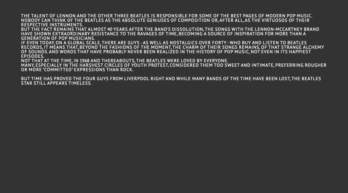The talent of Lennon and the other three Beatles is responsible for some of the best pages of modern pop music. Nobody can think of the Beatles as the absolute geniuses of composition or, after all, as the virtuosos of their respective instruments. But the fact remains that almost 40 years after the band's dissolution, the songs with the Lennon-McCartney brand have shown extraordinary resistance to the ravages of time, becoming a source of inspiration for more than a generation of pop musicians. If even today, on a global scale, there are guys - as well as nostalgics over forty - who buy and listen to Beatles records, it means that, beyond the fashions of the moment, the charm of their songs remains, of that strange alchemy of sounds. and words that have probably never been realized in the history of pop music, not even in its happiest episodes. Not that at the time, in 1968 and thereabouts, the Beatles were loved by everyone. Many, especially in the harshest circles of youth protest, considered them too sweet and intimate, preferring rougher or more "committed" expressions than rock. But time has proved the four guys from Liverpool right And while many bands of the time have been lost, the Beatles star still appears timeless.  space for the protagonists.